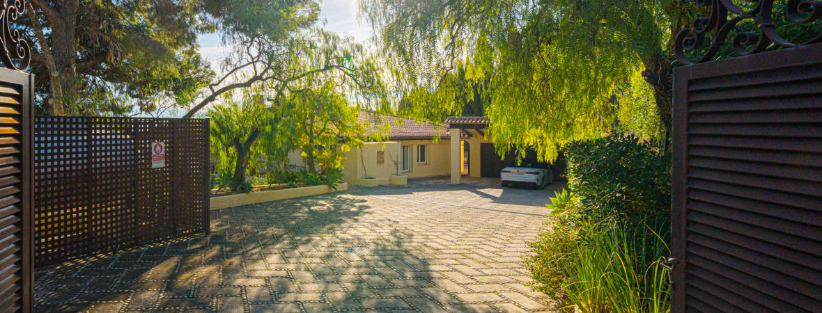 The mature gardens with beautiful fruit and flower trees. The
